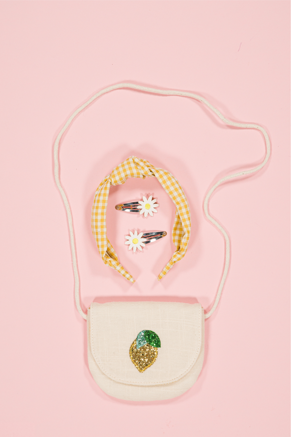 Ce sac à main en coton écru, rehaussé d'un citron pailleté sur le rabat, est parfait pour un look pétillant et vitaminé. Il permet de ranger les petits trésors.