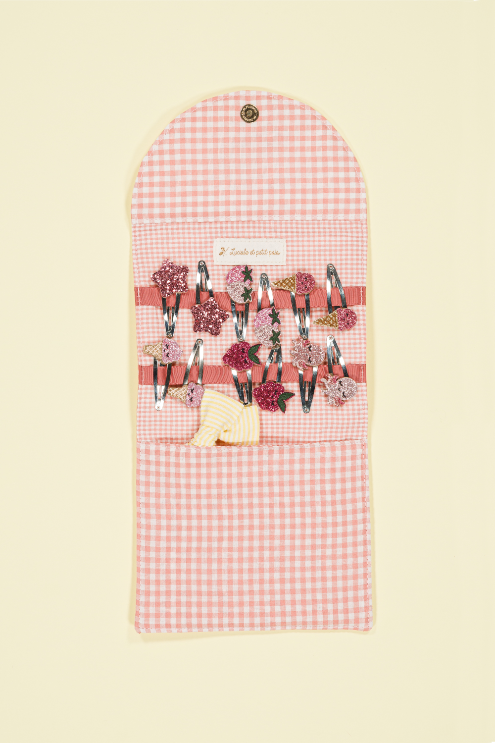 Cette pochette porte-barrettes est l'organisateur idéal pour ranger et afficher ses accessoires préférés. On craque pour son motif cerise glitter qui apporte une touche gourmande et joyeuse.