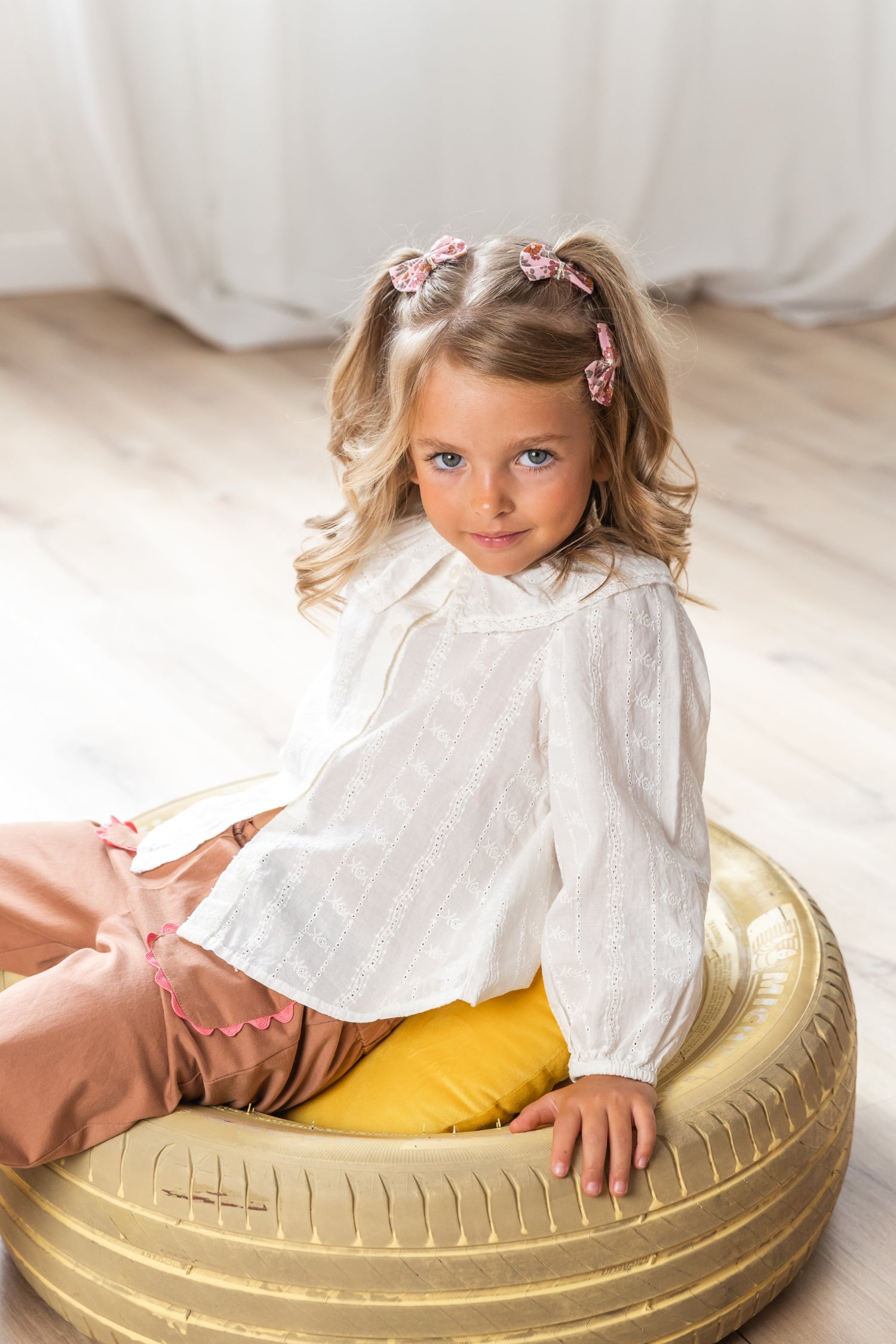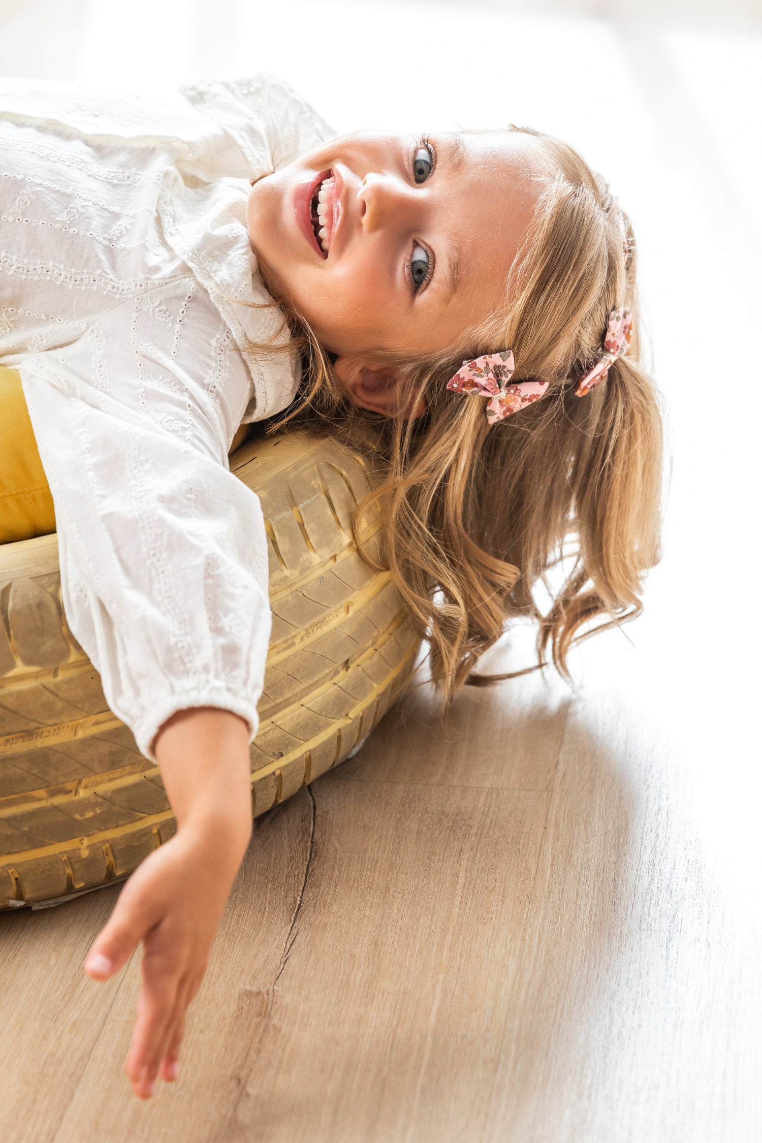 Ajoutez une touche fantaisiste à la coiffure de votre petite fille avec ce nœud papillon en tissu Liberty Capel floret "rose buvard" !