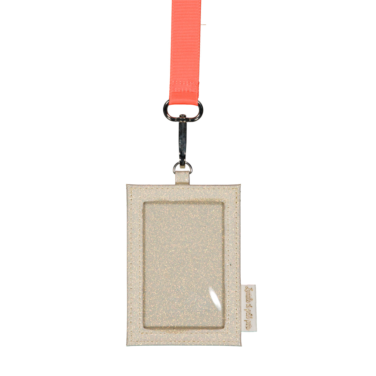 Pratique et ultra pétillant, ce porte-carte en tissu enduit pailleté crème est idéal pour garder les cartes de cantine, de transport ou d’activités toujours à portée de main. Son cordon en gros grain orange fluo tout doux le rend agréable à porter au quotidien.