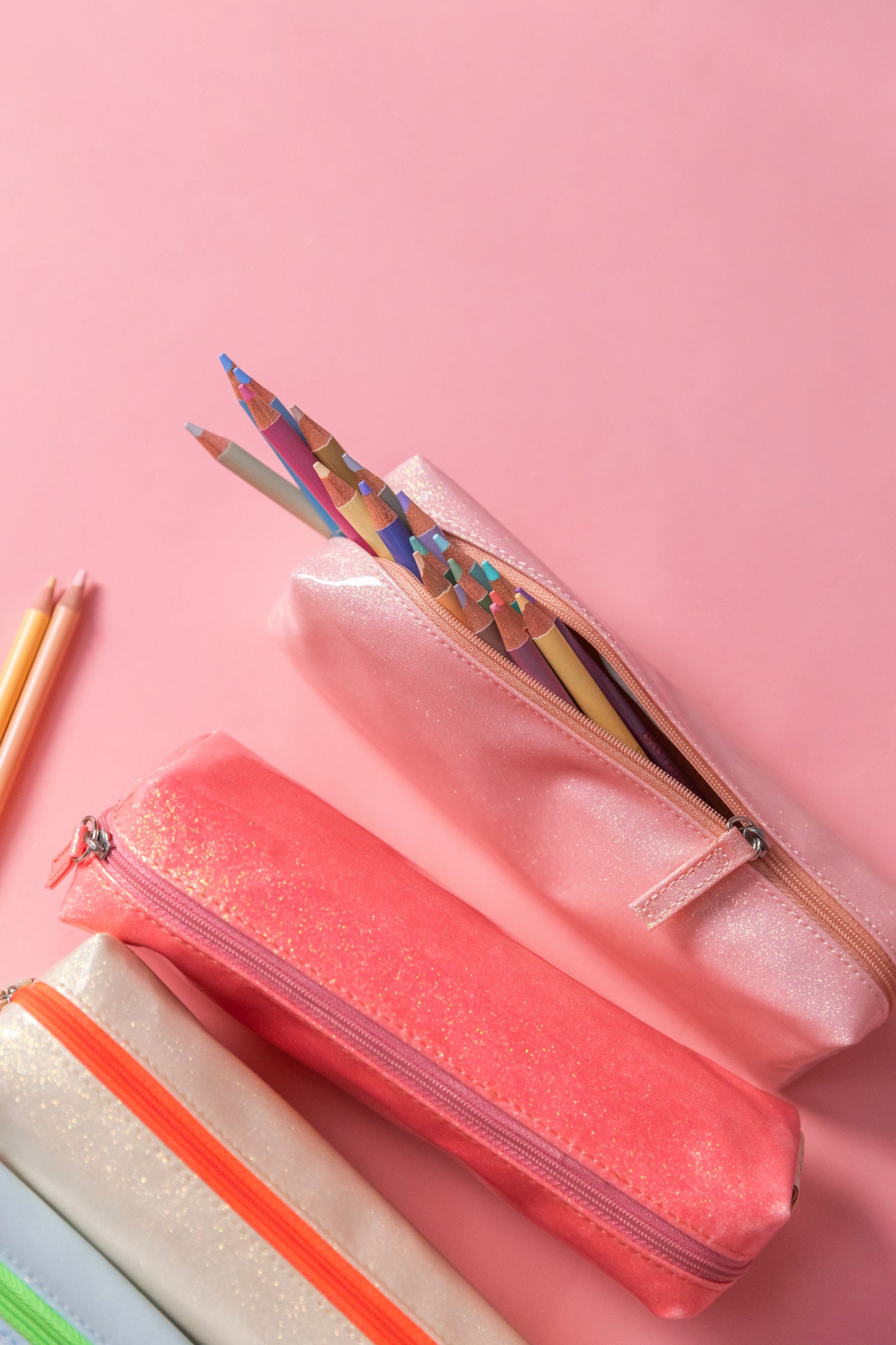 Back to school avec cette trousse en tissu enduit pailleté corail. Pratique et résistante, elle accueille stylos, feutres et tous vos petits trésors. Parfaite pour briller en classe comme en voyage !